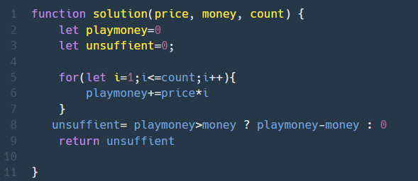새로 생긴 놀이기구는 인기가 매우 많아 줄이 끊이질 않습니다. 이 놀이기구의 원래 이용료는 price원 인데, 놀이기구를 N 번 째 이용한다면 원래 이용료의 N배를 받기로 하였습니다. 즉, 처음 이용료가 100이었다면 2번째에는 200, 3번째에는 300으로 요금이 인상됩니다. 놀이기구를 count번 타게 되면 현재 자신이 가지고 있는 금액에서 얼마가 모자라는지를 return 하도록 solution 함수를 완성하세요.