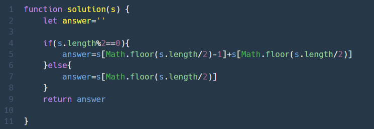 문제: 단어 s의 가운데 글자를 반환하는 함수, solution을 만들어 보세요. 단어의 길이가 짝수라면 가운데 두글자를 반환하면 됩니다.