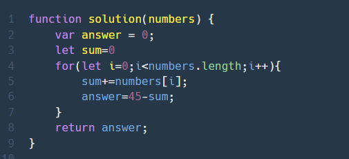 0~9까지의 정수 배열 numbers에서 없는 숫자를 찾아 더하는 문제이다.