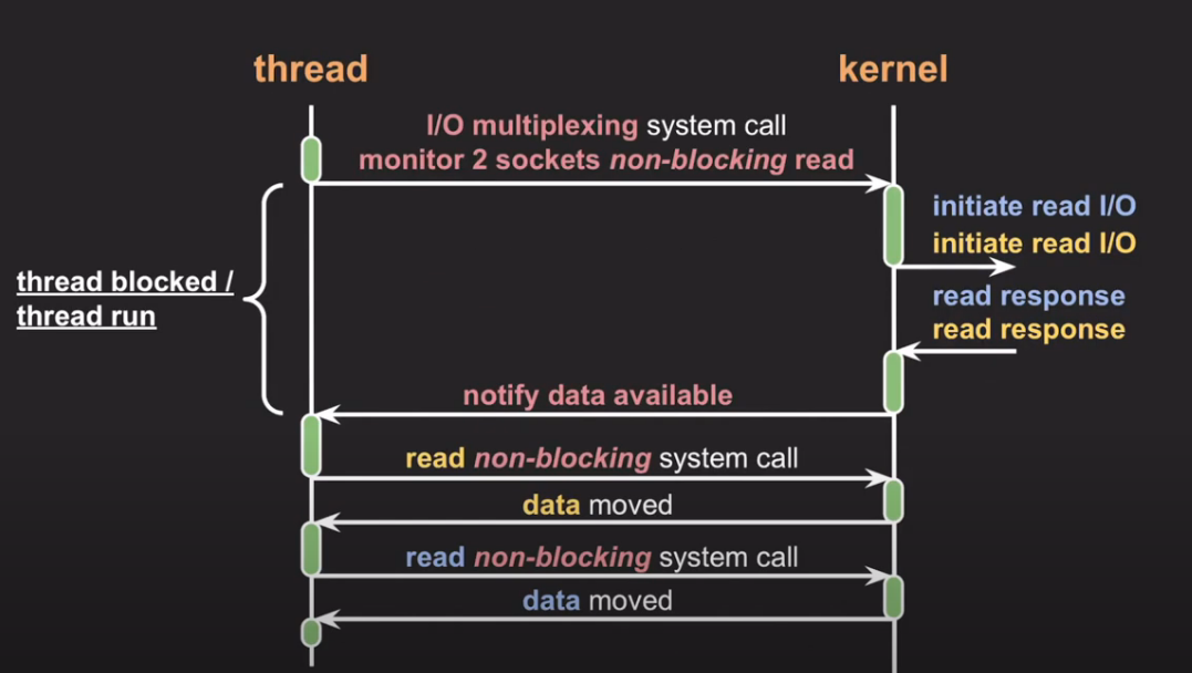 - multiplexing 으로 system call을 하면 상태에 따라 스레드를 블락시킬 수도 있고 안시킬 수도 있다.