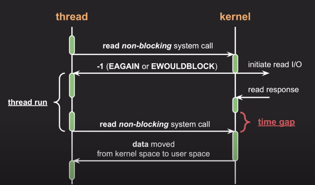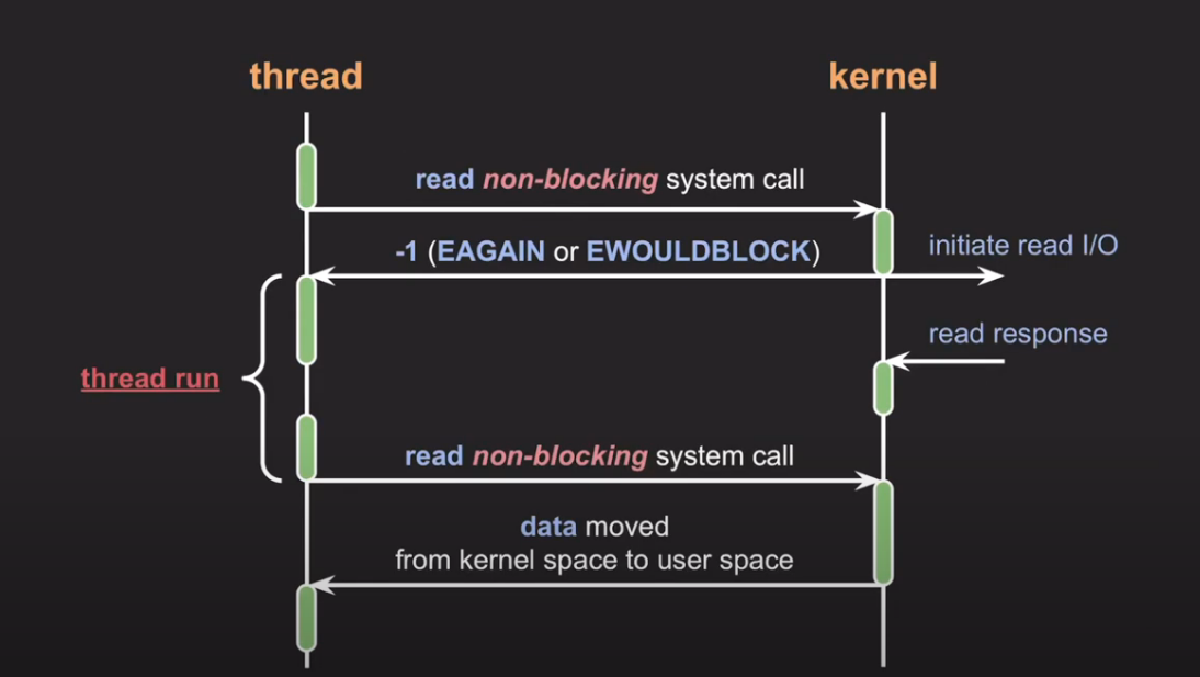 - 데이터가 없으면 없다고 알려주고 read system call은 바로 종료 ( 블락 안됨 )