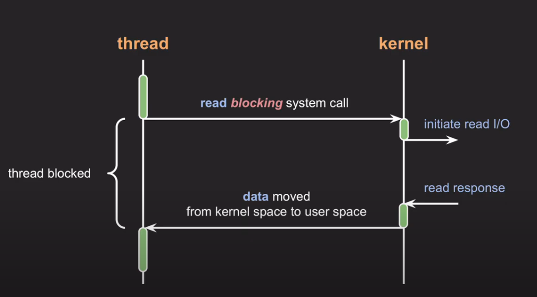 - 1번을 실행하다 blocking sysetmcall이 입력되면 스레드는 블락됨 => 스레드가 동작을 멈춤