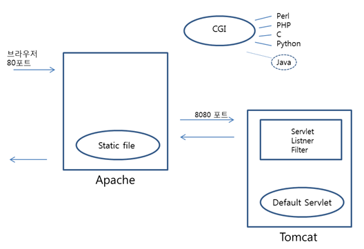 - 자바 웹 애플리케이션을 개발 할 때 주로 사용하는 조합은 아파치와 톰캣이다.