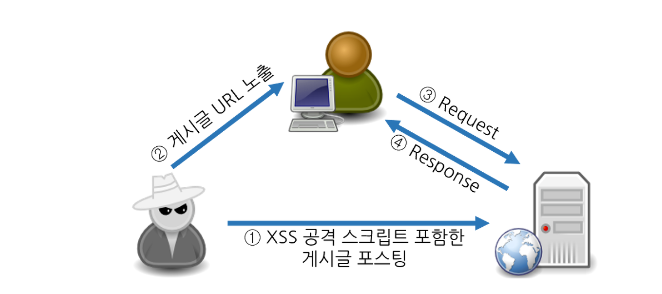 - 공격자는 XSS 공격 스크립트를 웹 사이트 방명록, 혹은 게시판에 삽입한다.