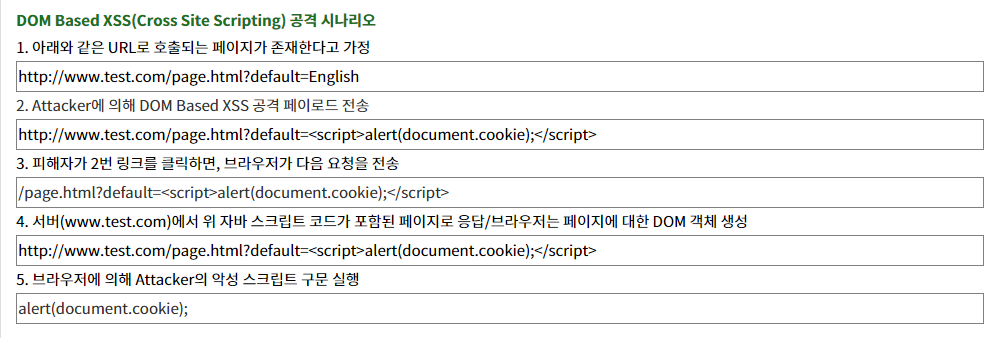 즉 페이지 자체(HTTP 응답)은 변경되지 않지만, 페이지에 포함된 클라이언트 측 코드는 DOM 환경에서 발생한 악의적인 변조로 인해 공격 구문이 실행된다.