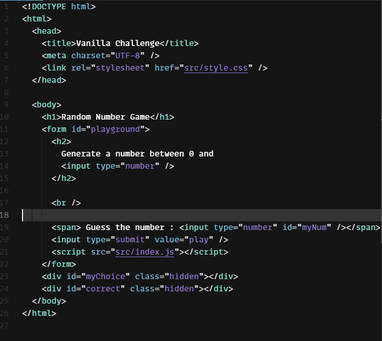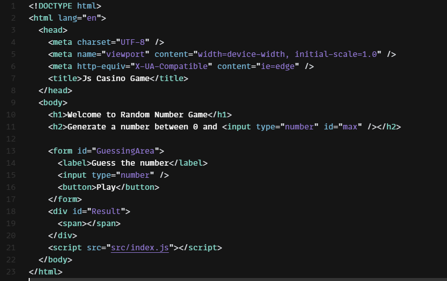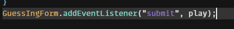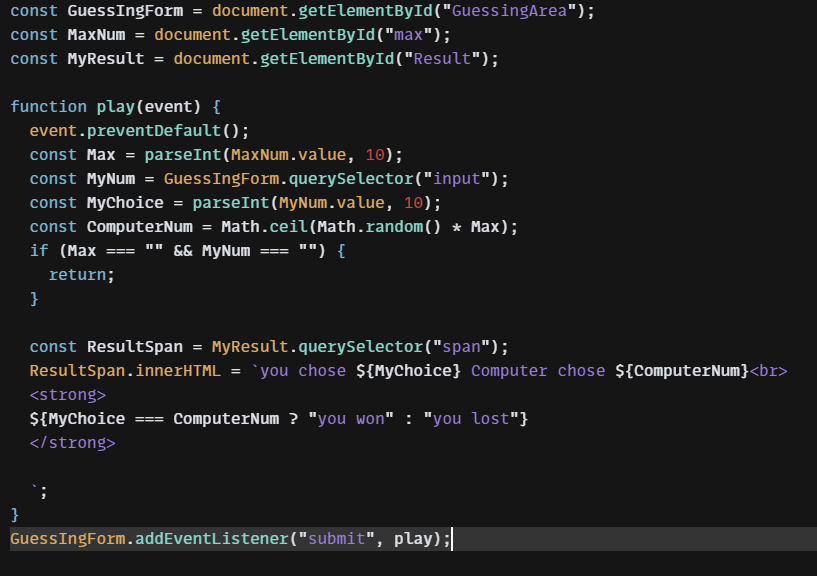 2) Play라는 버튼을 누르면 submit이 되면서 실행되야 하기 때문에 form태그 안에 넣어주고 받아올 수 있도록 GuessingArea라는 id값을 넣어주고 입력할 수 있도록 input을 넣어준다. 버튼을 누르면 Result div안에 있는 span에 내가 고른 번호와, 컴퓨터가 선택한 번호 그리고 결과를 나타나게 해줄 것이다.