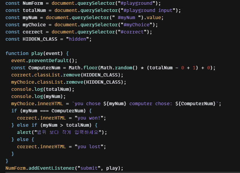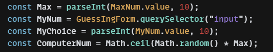 form태그 안에 있는 input값을 받아와 MyNum에 넣어주고 parseInt함수를 이용하여 숫자로 바꾸어 준다.