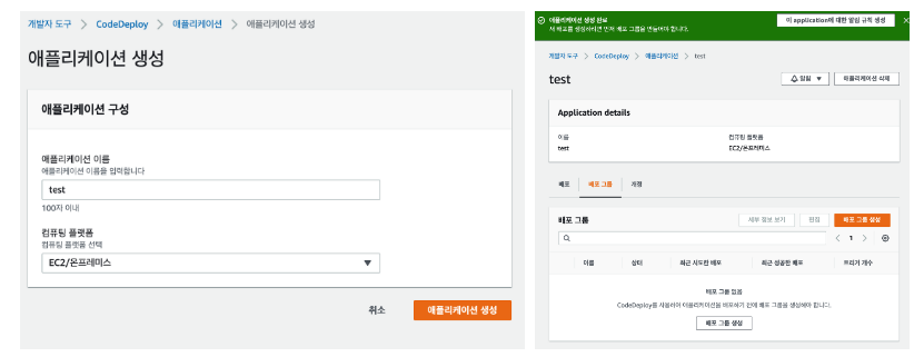 자동 배포를 위한 메인 서비스인 CodeDeploy 애플리케이션을 만들어줘야 한다.