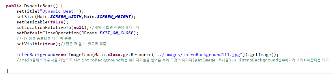 먼저 몇가지 정해줘야 하는데 이름, 사이즈, 사이즈 조절여부, 화면이 나타날 위치, 그리고 중요한 게임창을 종료할 때 같이 프로그램이 종료되는 setDefaultCloseOperation를 이용해주어야한다. 그 다음 만든 것을 볼 수 있도록 setVisible를 해준다.