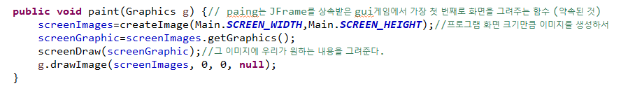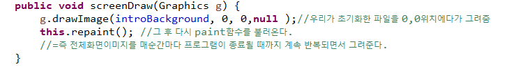 여기서 this.repaint()를 사용하는 이유는 전체화면 이미지를 매순간마다 프로그램이 종료될 때까지 계속 반복하면서 그려주려고 하기 때문이다. 그러면 buffer에 이미지를 담았다가 바로 호출하기 때문에 속도가 빠르고 버퍼링 현상이 줄어들 수 있다.