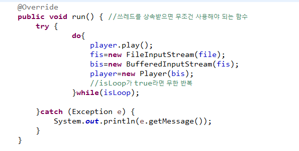 이 함수는 쓰레드를 사용하면 무조건 사용해야하는 함수로 음악을 실행시키는 함수이다.