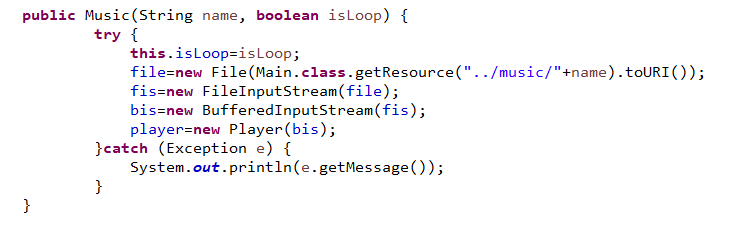 Music의 introMusic에 음악파일의 이름과 true을 넣어준 다음에 실행해주는 start()함수를 넣어 음악을 실행할 수 있게 해준다. 여기서 start()를 사용하는 이유는 음악을 실행시키는 스레드와 게임의 실행을 병행적으로 수행하기 위한 것이다.!