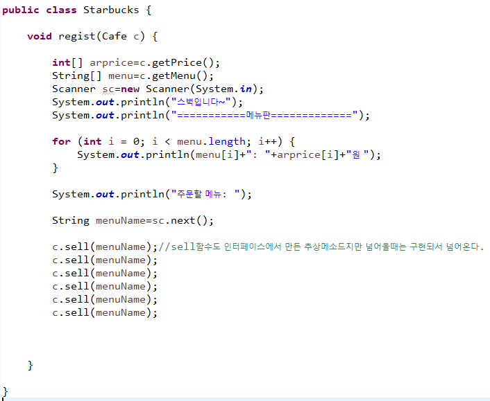 스타벅스 클래스에서 그 인터페이스 Cafe를 객체로 받으면서 regist()를 수행한다.