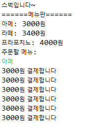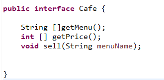 interface Cafe는 메뉴,가격배열과 입력받은 menuName을 파는 메소드를 가지고 있고
