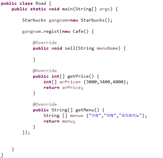 여기서 익명클래스가 나온다. 스벅객체 gangnam을 만들고 regist하면 추상클래스 c를 넘긴다. 따라서 익명클래스 타입인 new Cafe를 넘기게 되고 new Cafe(){ }가 전체 객체가 된다.