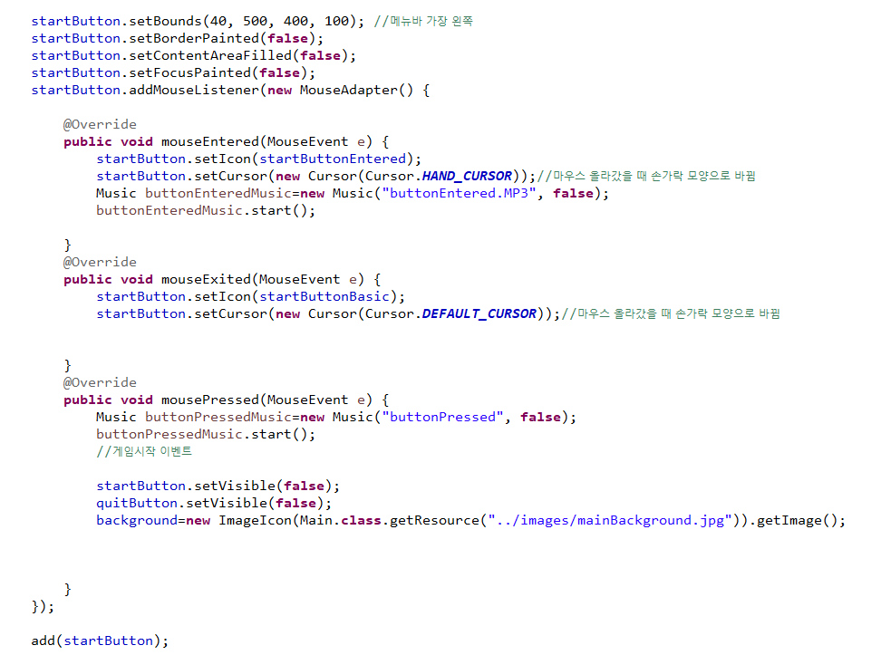 버튼은 총 4가지 인데 시작버튼 마우스가 올라갔을 때의 시작버튼, 종료버튼, 마우스가 올라갔을 때의 종료버튼 이다.