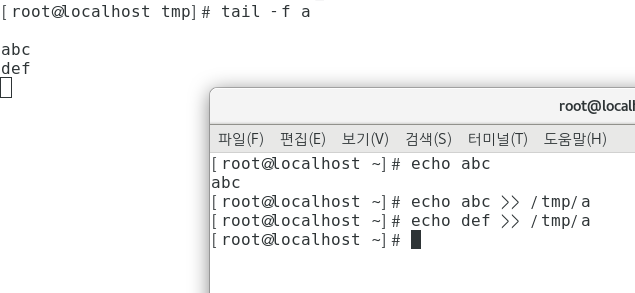 | 파일의 뒷 부분 몇행 출력 | tail [옵션] 파일명 | +행번호 : 지정한 행부터 끝까지 출력 -숫자 : 화면에 출력할 행의 수를 지정(기본 값 10) -f : 파일 출력이 종료되지 않고 주기적으로 출력 |