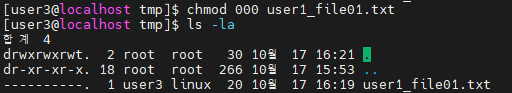 chmod 000 user1_file01.txt. 를 넣어주면 이 파일의 모든 권한이 없는 것을 볼 수 있다.