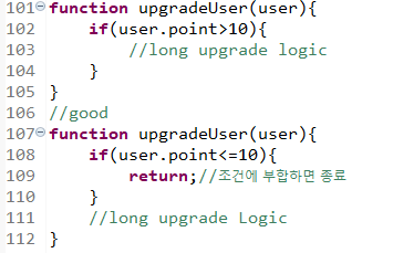 하지만 이것은 가독성이 떨어질 수 있다. 따라서 107번줄에 있는 함수처럼 ealry return을 해주고, 처리할 로직을 밖에 적어야 가독성이 좋아진다.