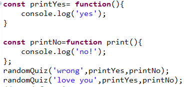 이 경우 첫 번째 randomQuiz는 no! 두 번째는 yes!가 출력되게 된다.
