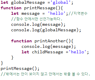 printAnother는 printMessage의 하위에 있기 때문에 접근이 가능하지만 childMessage는 printMessage가 접근할 수 없다.