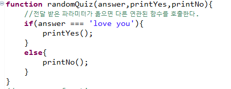 callback은 위에 예시로 볼 때 answer가 love you면 인자값 printYes을 호출하교 아니면 printNo를 호출하는 함수이다.