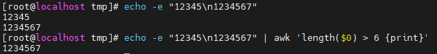 $0은 전체를 의미하고 awk 'length'를 사용하여 길이가 6보다 큰 것을 출력한다고 시킬 수도 있다.