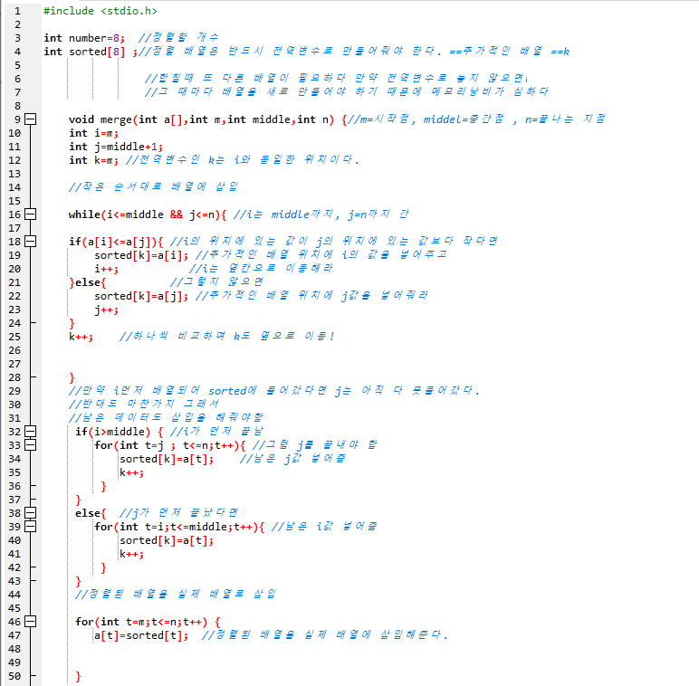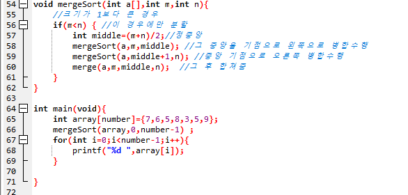 병합정렬은 퀵정렬가 달라 피벗 값이 없고 항상 반으로 나누는 특징이 있다