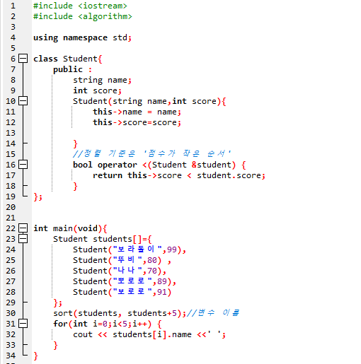 operator 함수는 점수가 작을 경우 true값을 반환하게 설정하여 즉 점수가 작은 순서대로