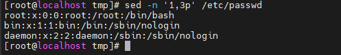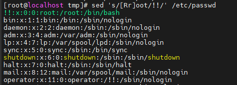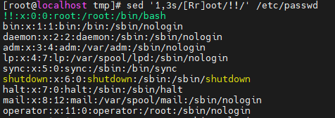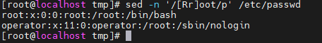 [root@localhost tmp]# sed '/[Rr]oot/d' /etc/passwd