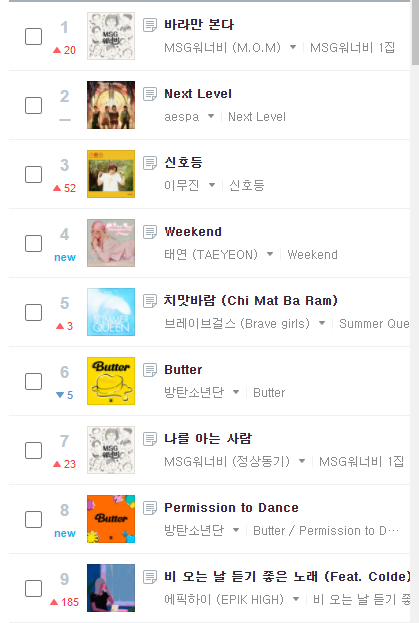 이렇게 있다면 필요한 것은 1 2 3 과 같은 순위와, 바라만 본다, next Level과 같은 제목, 그리고 MSG워너비, 에스파와 같은 정보가 필요하다