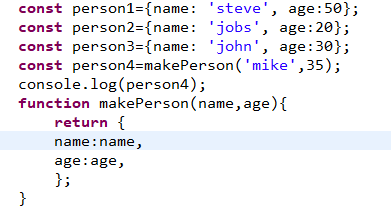 이 예제는 사람object를 만드는 예제이다. 이름과 나이를 가지고 있는 사람 object 을 만들때 계속 나열하면 만들기보다는 function makePerson처럼 함수를 이용해 만드는 것이 용이하다.