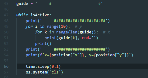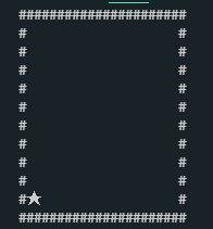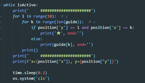 i는 y축이고 k는 x 축이기 때문에 guide로 만든 x축 길이만큼 길이를 잡아주면 위와 같이 속이 빈 사각형을 만들 수 있다. time.sleep(0.1)과 os.system('cls')는 키보드가 눌려서 실행될 때 0.1초 쉬고 지웠다가 다시 나타나게 해주는 것이다. 따라서 별의 위치를 실시간으로 볼 수 있는 것이다.