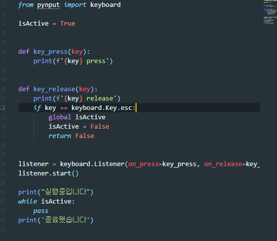 먼저 pynput 를 깔아주고 키보드 값을 받을 수 있게 keyboard를 import 해준다.