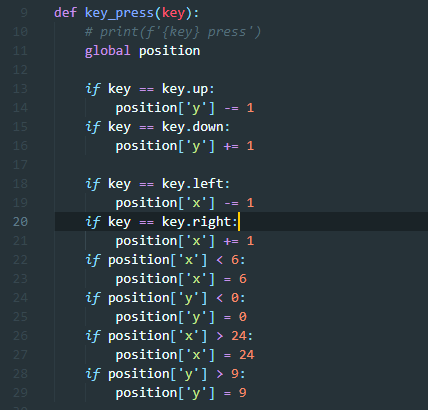 딕셔너리 position = {'x' : 6, 'y' : 0}로 처음 별의 위치를 잡아주고