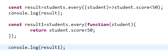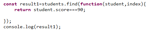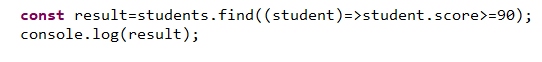 callback함수는 boolean타입으로 true,false를 리턴합니다. 인자값으로 element, index, array ,this를 넣어 전달할 수 있다. students 배열을 돌면서, 90점 이상이 아닌 학생은 FALSE를 리턴하고 90이상인 학생이 나오면 TRUE를 리턴하고 끝낸다.